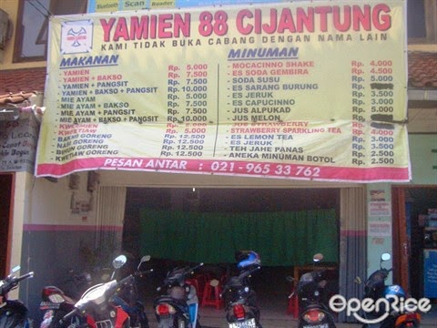 Yamien 88 cijantung merupakan yamien legendaris yang banyak diperbincangkan orang orang. Menu utama dari rumah makan ini adalah mie yamien kelezatan dari mie yamien 88 yaitu tidak hanya rasanya saja yang manis tetapi juga ada beberapa pilihan rasa yang diinginkan sesuai selera anda. Haha yamien 88 ini salah satu tempat makan terlegend di cibubur. Yamien bakso pangsit rp 23 000 semangkuk mie yamien dengan campuran sawi tauge potongan ayam pangsit basah dan bakso kuah yang disajikan terpisah.