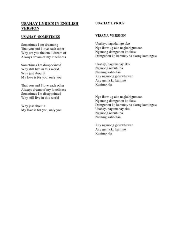 Lyrics for usahay by noel cabangon usahay nagadamgo ako nga ikaw ug ako nagkahigumaan nganong damguhon ko ikaw damguhon ko kanunay sa akong kamingaw usahay nagamahay ako nganong nabuhi pa nianing kalibutan kay nganong gitiawtiawan ang guma ko kanimo kanimo da. Usahay nagadamgo ako br nga ikaw ug ako nagkahigumaan br nganong damguhon ko ikaw br damguhon ko kanunay sa akong kamingaw br usahay nagamahay ako br nganong nabuhi pa br nianing kalibutan br kay nganong gitiawtiawan br ang guma ko kanimo br kanimo da. Usahay magadamgo ako nga ikaw ug ako nagkahigumaay nganong damgohon ko ikaw damgohon sa kanunay sa akong kamingaw.
